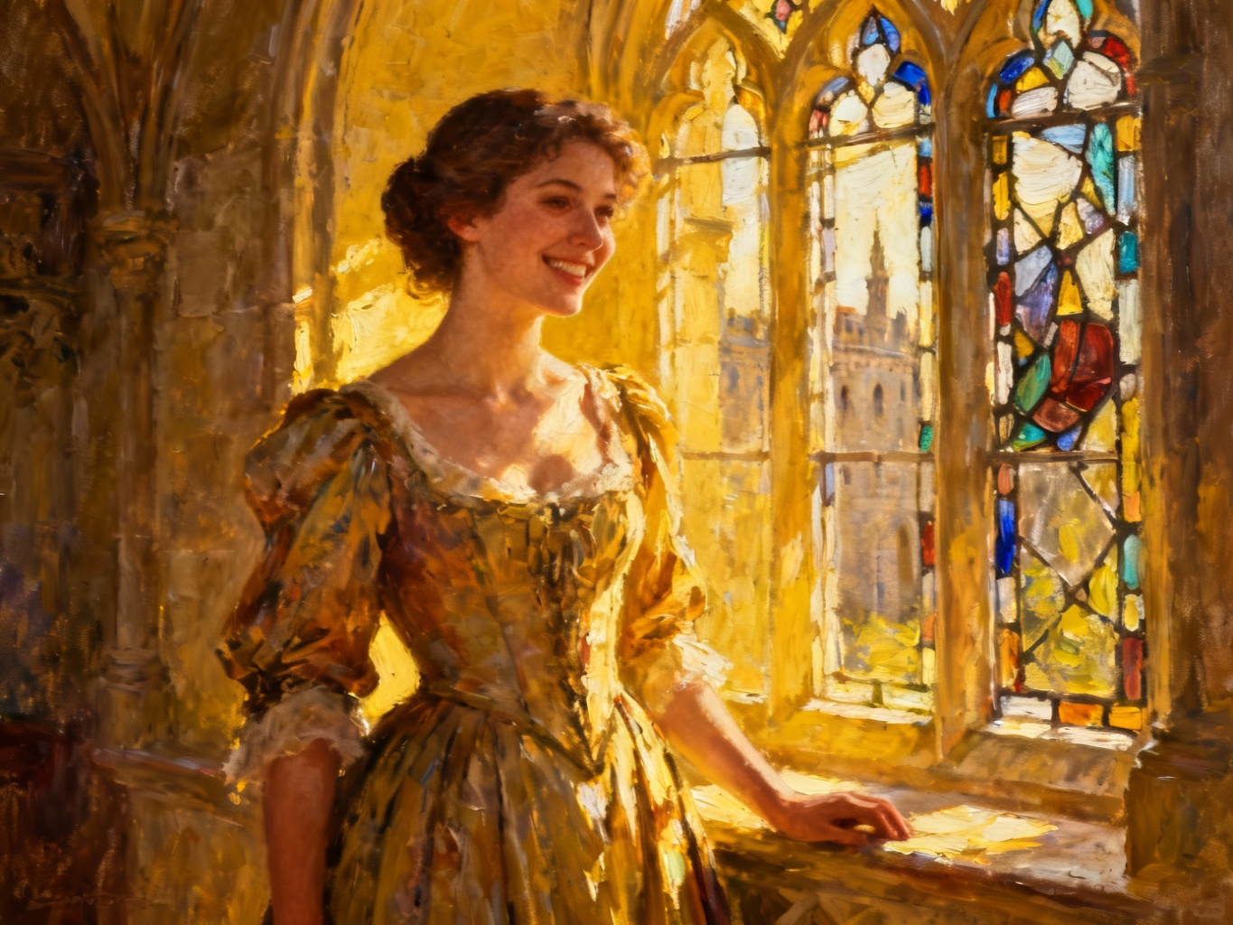 An elegant lady in a vintage dress, standing by a castle window, sunlight through stained glass, smiling, warm tones, oil painting style