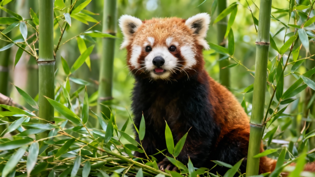 A red panda in a bamboo forest, adorable expression, natural light, green tones, vivid and fun