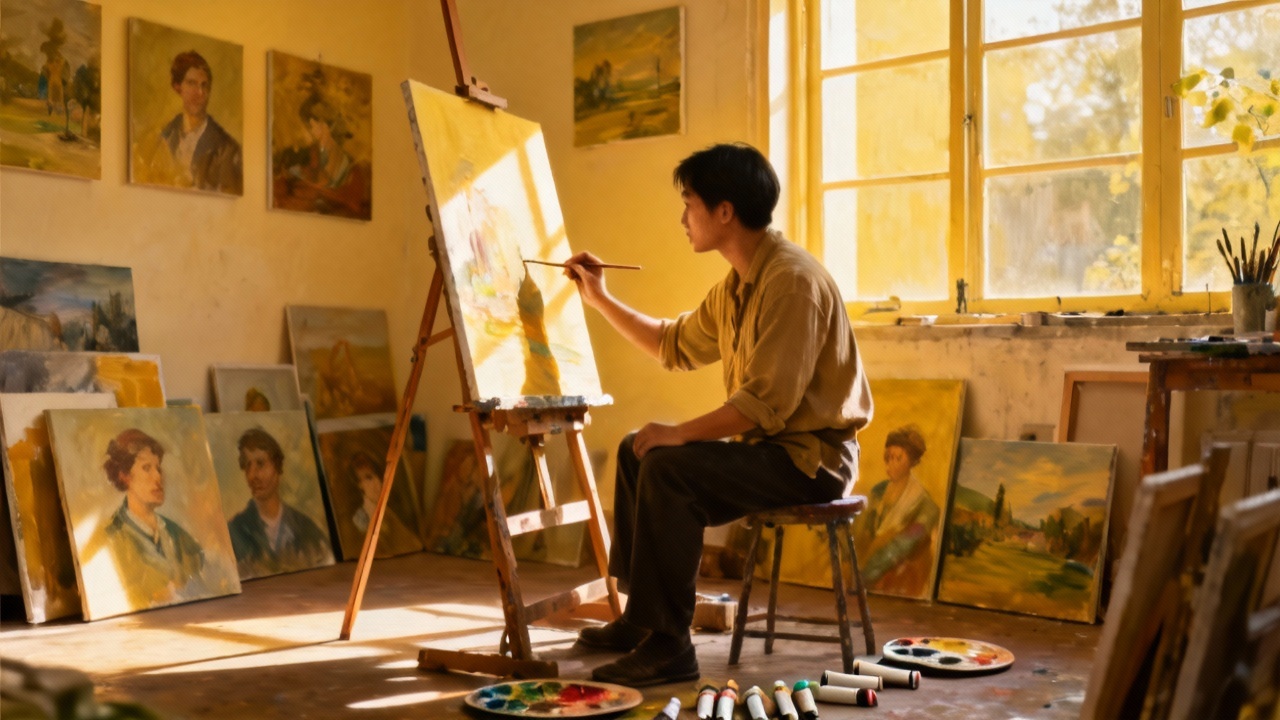 An artist creating in a studio, surrounded by paintings and paints, focused expression, natural light, artistic atmosphere
