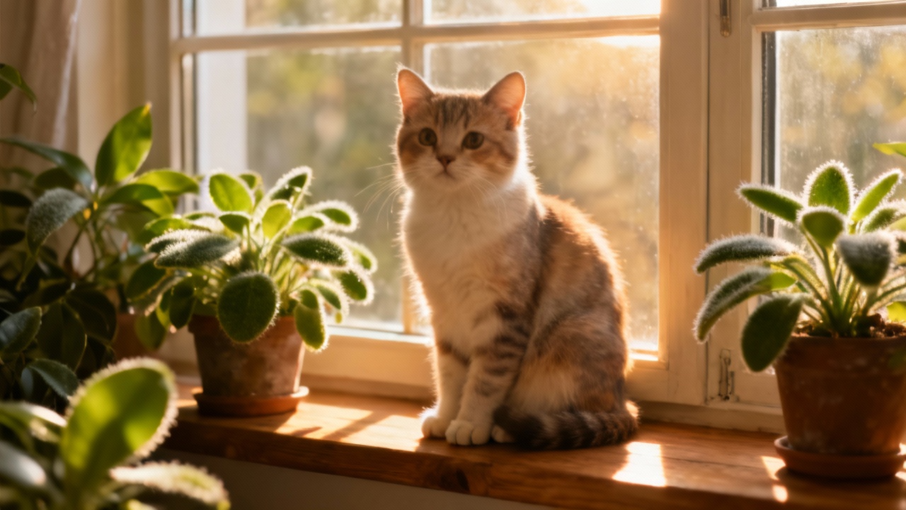 A cute cat sitting on a windowsill, sunlight streaming through, warm afternoon, indoor plants, soft tones, realistic style
