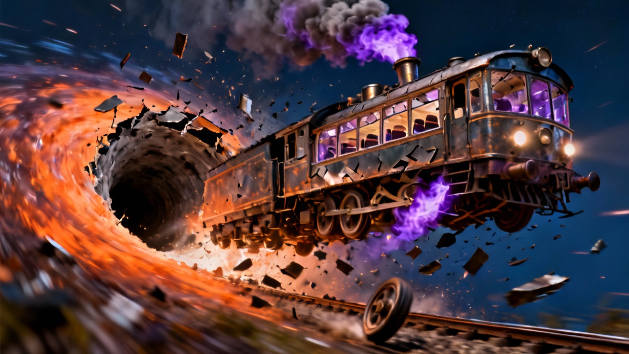 This image depicts a fantastical and dramatic scene featuring a vintage steam locomotive bursting through a swirling, fiery tunnel. The train has a metallic, weathered appearance and is in mid-air, propelled with great force. The background shows a dark blue sky, contrasting vividly with the bright colors of the fire.